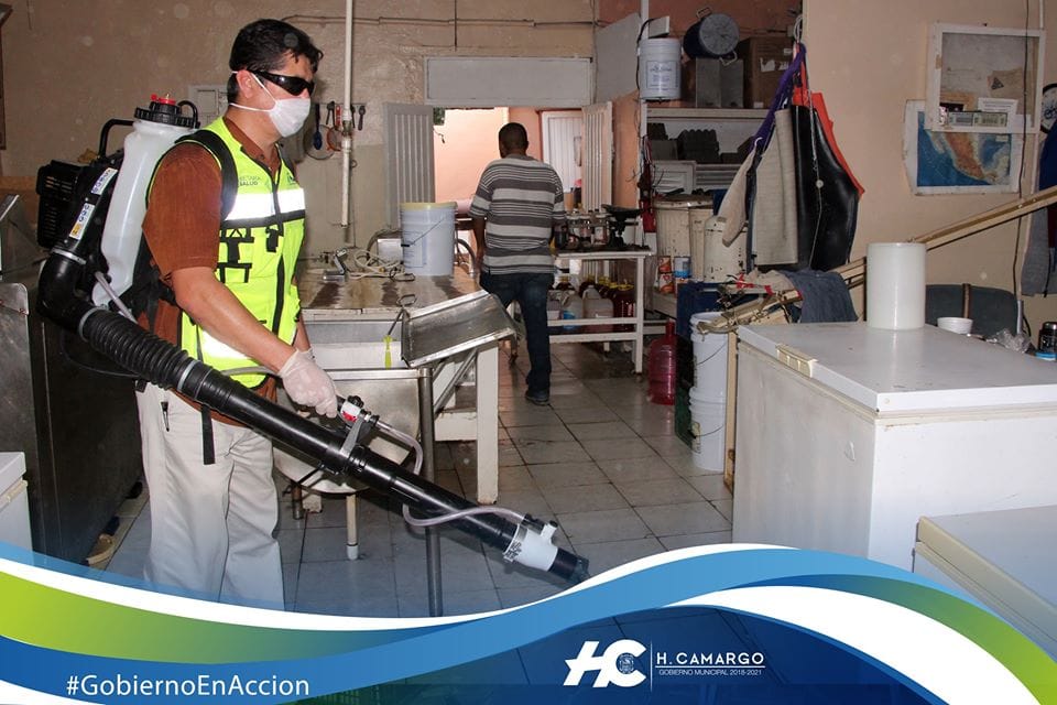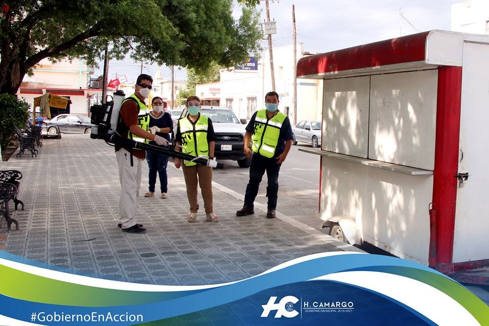 H. Camargo, Tam.- El Gobierno Municipal en coordinación con la Comisión Estatal contra Riesgos Sanitarios, pusieron en marcha este miércoles una campaña de sanitización con moto mochila en espacios públicos y comercios de esta cabecera municipal, cajeros automáticos, tiendas de auto servicio y lugares donde se concentre la gente, como plazas públicas.